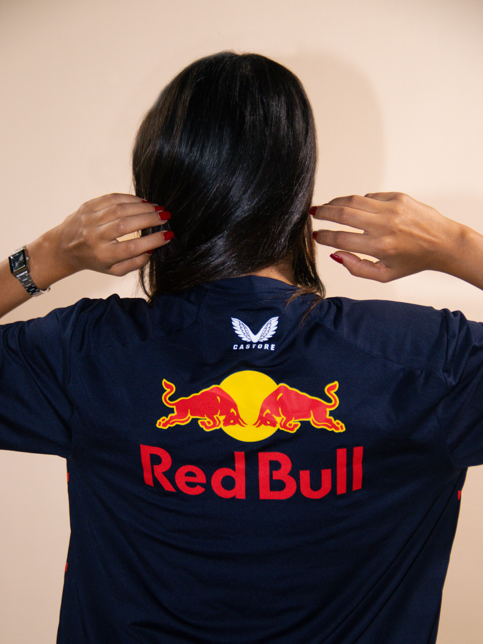 Design puissant : couleurs emblématiques Red Bull, finitions sport-chic et coupe moderne.